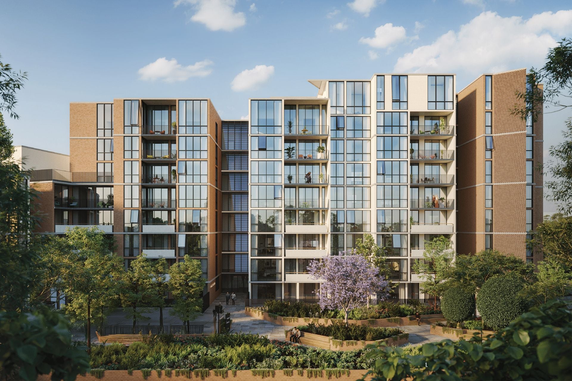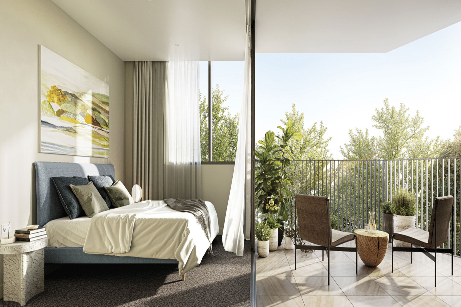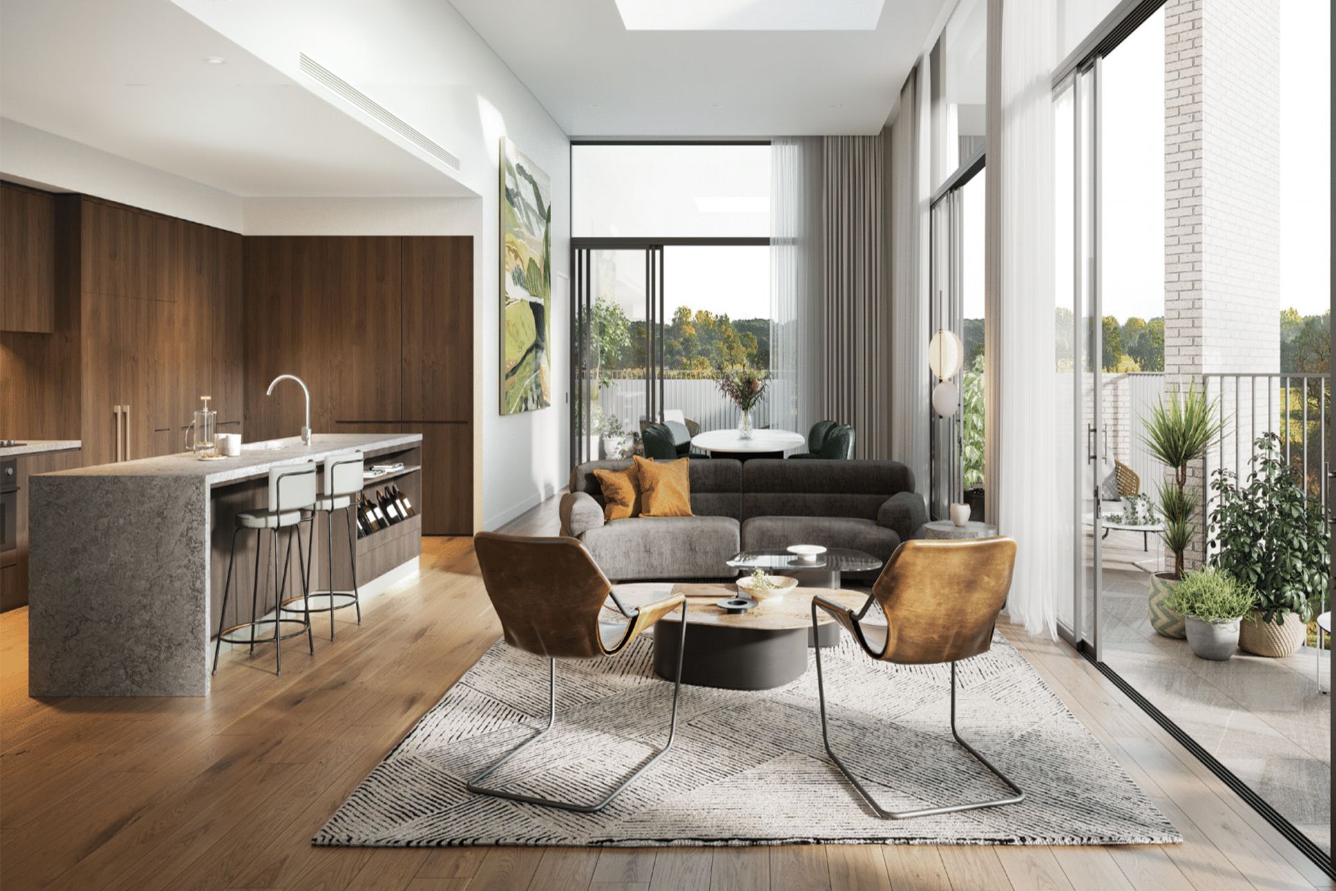 The apartment is filled with natural light through high-ceiling windows, and it offers downlights, ducted air conditioning, and hybrid flooring.
